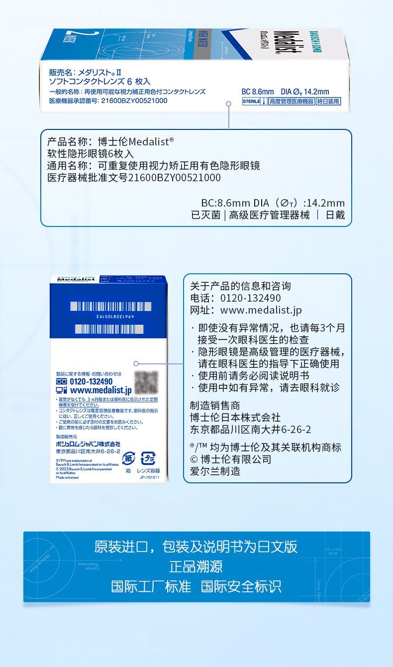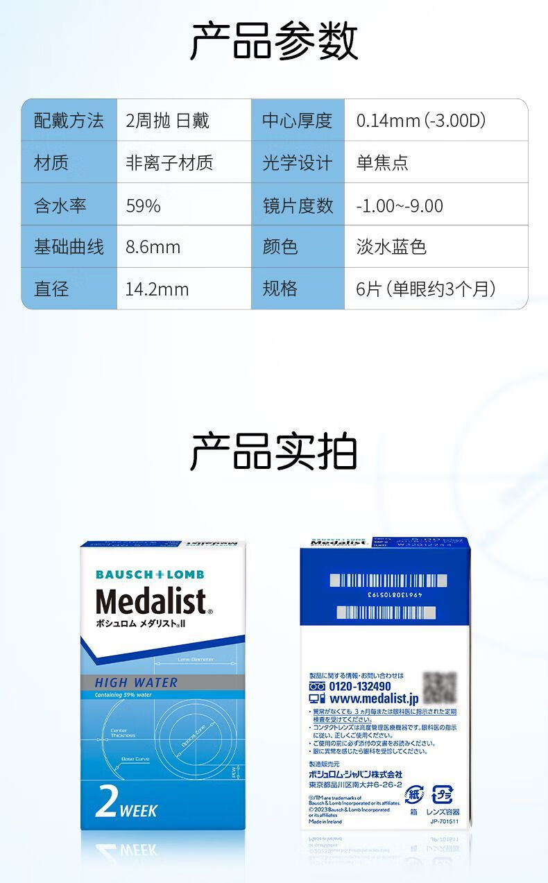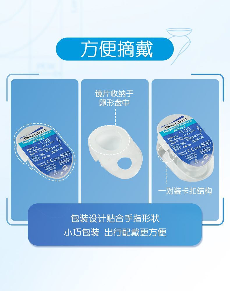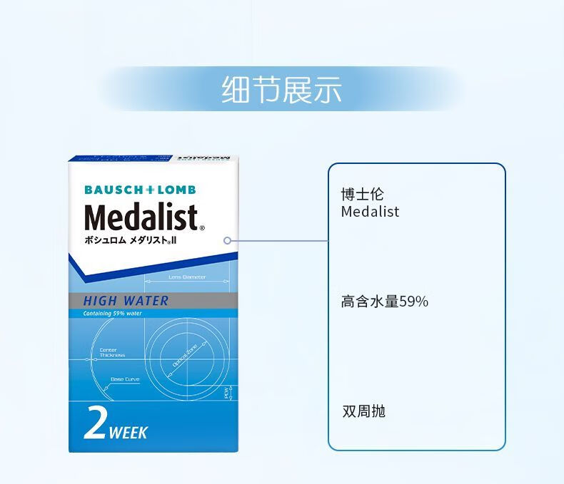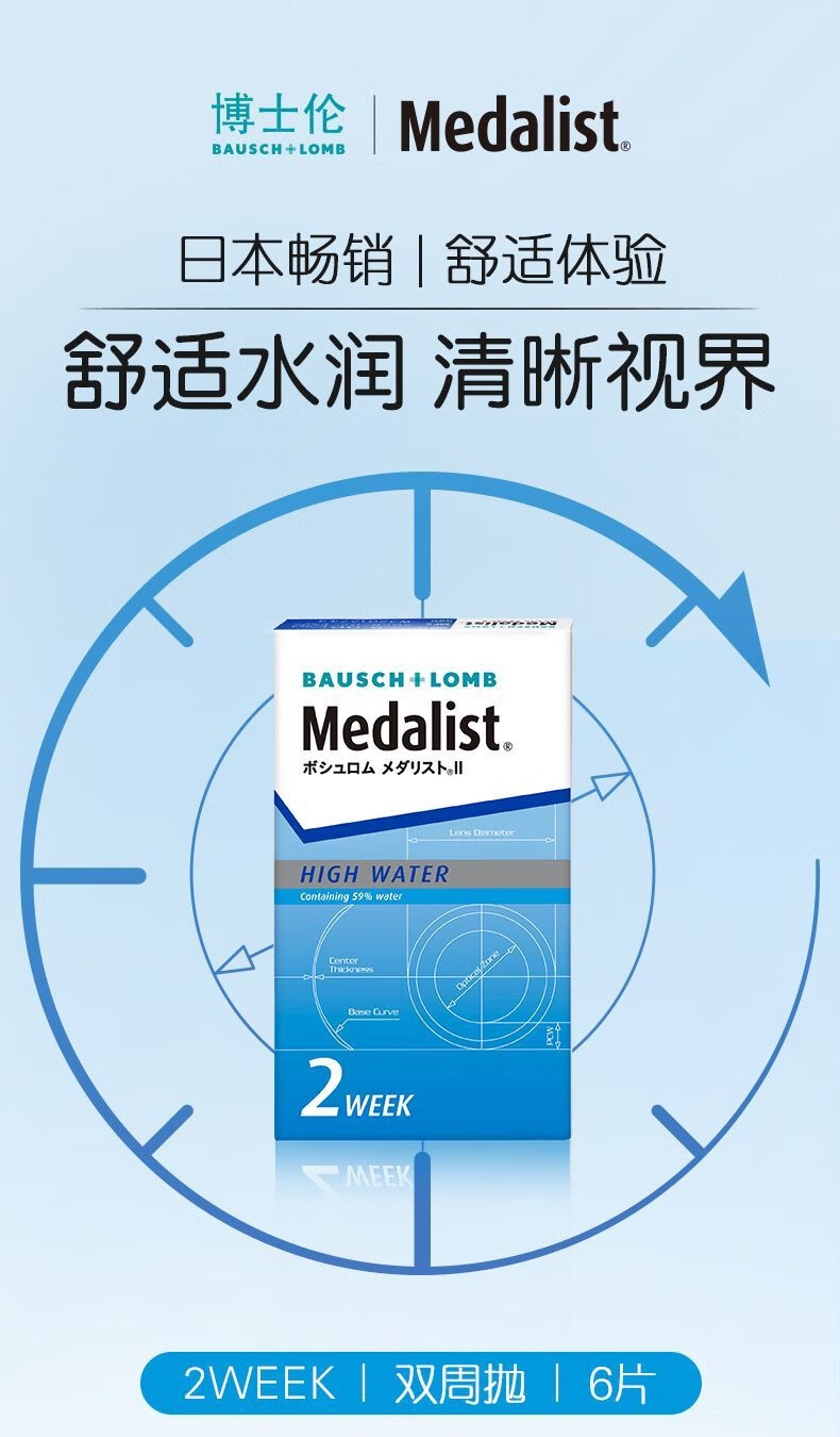 博士伦Medalist隐形眼镜双周抛2盒12片半月抛透明近视隐形眼镜 900度