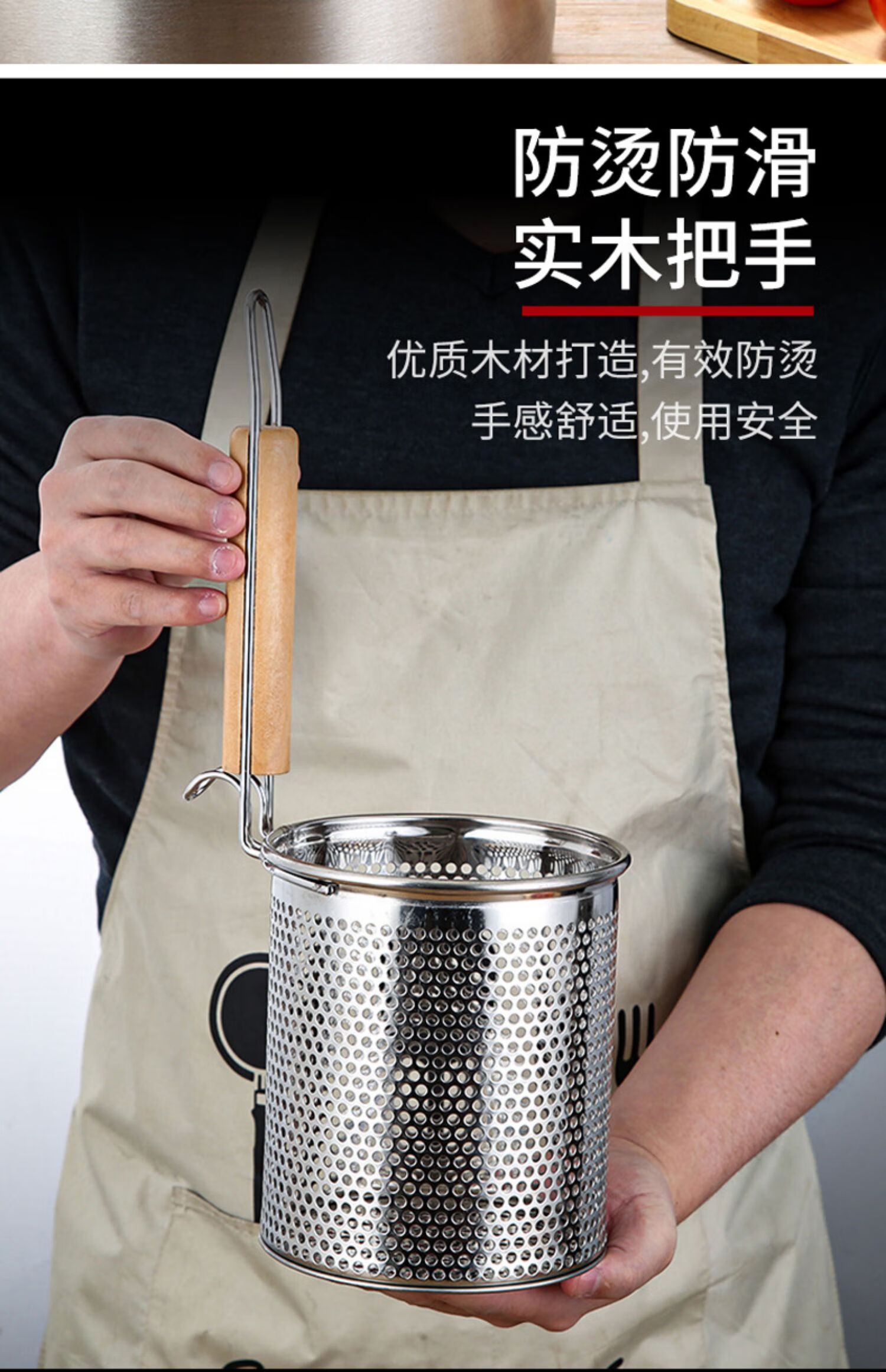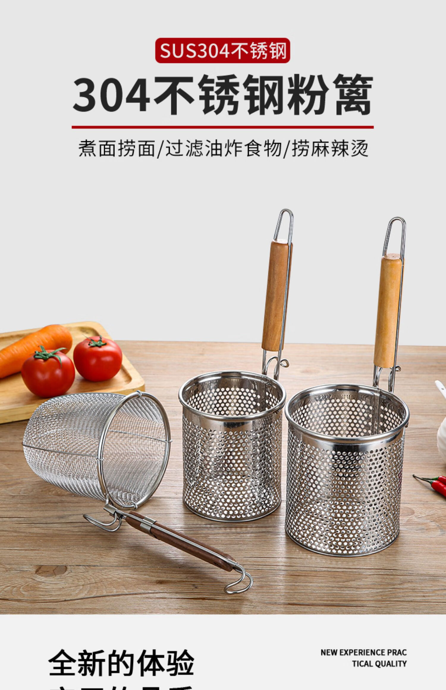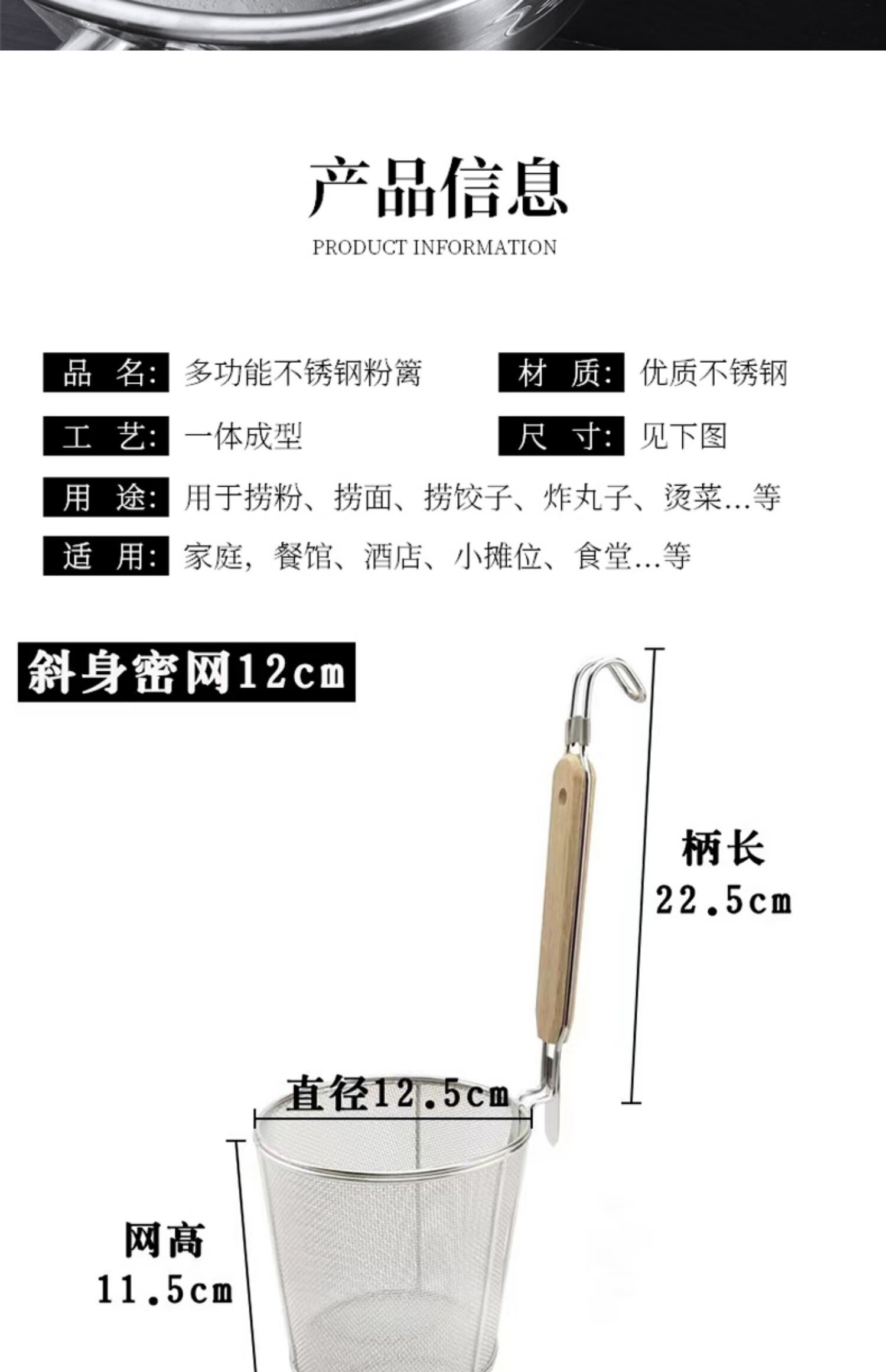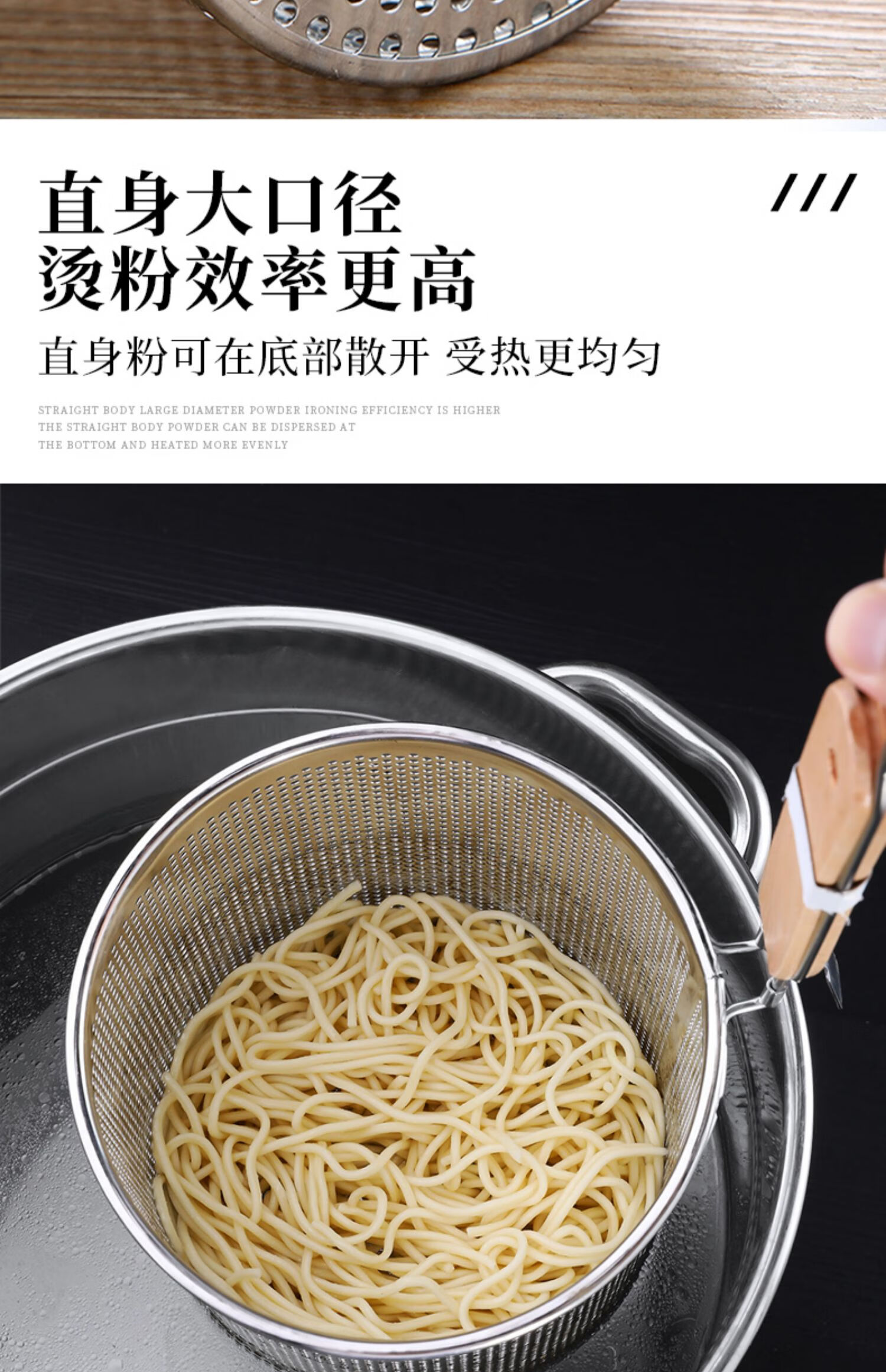 PJ煮面漏网烫菜篓子麻辣烫漏筐不锈钢煮粉漏斗粉篱下面下粉捞 加厚木柄线条粉篱